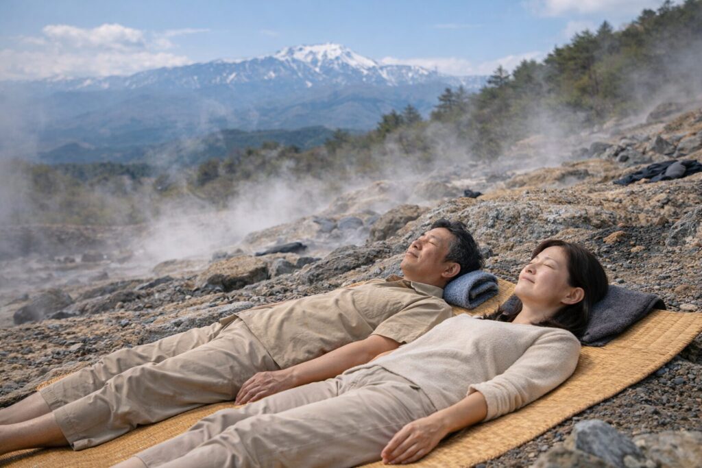 玉川名物の天然岩盤浴場。観光客は手前のエリアで満足しがちですが、さらに奥へと進むと、地熱がより安定した常連たちの静かな定位置があります。仕事休みにゴザを抱えてそこへ向かい、地熱に身を委ねながら奥羽山脈の空を眺める。それは、都会の病院では決して得られない、地球の鼓動を感じる究極のセルフケアです。